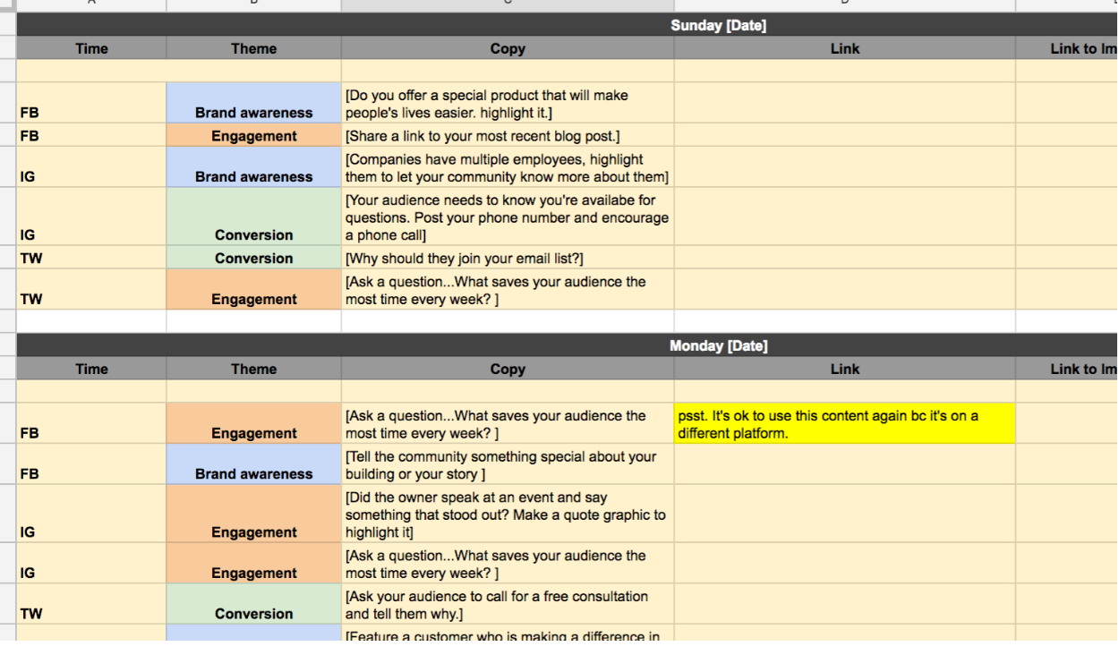 The second tab will outline your daily posting schedule. We’ve given you a week’s worth of generic ideas. Once you nail down your specific content themes, this step will be a breeze!